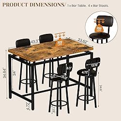 Durable & Reliable: Bar height table and chair set is constructed with MDF for steadfast support. The thick metal frame of the dining table is coated to prevent rust Ergonomic Comfort Dining Table with Chairs: The bar kitchen table chairs set of 4 PU leather bar stool seats are expanded to a 13.8" diameter with a 100° for back support and upholstered with soft foam Compact Dinner Table for 4: Dining set is an ideal for small spaces. Modern dining chairs can be stored underneath the table. Can be used for apartments, and areas with limited kitchen & dining room 5 Piece Dining Table Set: Dining set for 4 with a classic wood grain finish, this stylish bar dining set is a timeless addition to any home. Bar chairs set of 4 versatile for multiple uses Simple Assembly: This kitchen table set for 4 includes straight forward assembly instructions and all the required tools. Each part is clearly labeled to facilitate a quick assembly process