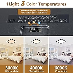 【3 Color in 1 Ceiling Light】This Square LED flush mount ceiling light offers 3 color temperatures for you to choose: 3000K (Warm White), 4000K (Neutral White) and 6000K (Daylight White).Please choose the color you like before installation. (NOTE:Non-Dimmable) 【Energy Saving】Our LED ceiling light fixture with 3000 lumens at only 30W (equivalent to a traditional 110W fluorescent), a great alternative to traditional light bulbs, which is more energy-saving and more efficient. Long-term use can save you more than 85% of energy. 【Ultra Slim Panel Design & Well Sealed】Our close to ceiling light is designed with one-piece sealing,which is well sealed to prevent dust and flying objects from entering.With IP42 waterproof rating, it provides excellent performance in wet conditions.The thickness of the whole ceiling lights is only 0.9 inch,which is perfect for low ceiling,with universal base design to fit most junction boxes. 【Excellent Lighting Performance】Built-in high-quality LED chips in square ceiling light,providing you with brightly, evenly, flicker-free and clean soft light. With a high CRI of 85, ensures a true and vivid lighting experience in your home 【Easy to Inastall】Universal base design makes LED fixtures compatible with most junction boxes and includes clear instructions for quick installation of bright fixture ceilings in minutes with just a few simple steps. 【Wide Application】The shape of 12 inch Square flush mount ceiling light with a simple and elegant design. Only 0.9inch ultra slim made it perfect for any low ceiling area, such as kitchen, bathroom, bedroom, living room, hallway, basement, utility room, cloakroom, stairs, or any other dark area needs more bright.
