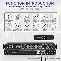 All-metal KTV preamp reverb effector: Newly upgraded anti-howling digital mixer reverb, using high-definition LCD color digital screen, always grasp the working status. Built-in effect smart chip, sensitive big knob and metal shell. Computer Control Adjust The Parameters: The panel is equipped with a USB interface, Easily connected to a computer via a data cable. Can be directly in the software to adjust parameters, very convenient Supports 6 inputs: DVD audio input, AUX audio input, optical and coaxial input, USB and Bluetooth input. 4 microphone inputs. Supports subwoofer output, center speaker output, front left and right channel output, surround left and right channel output. Note: If using an optical connection, the purchaser's audio output device must have an optical output connector in order to be used Real Dual-ECHO Adjustment:Music/ Microphone/ Sub/ Reverb/ Echo/ EQ. Adjusts to the characteristics of the music/singer/usage scenario to dial in a more balanced and appropriate tone Intelligent anti-whistling: adopts multi-point frequency shifting technology to eliminate whistling in the sound reinforcement system, bringing a more comfortable experience. Also prevents damage to microphone and speakers Infrared Remote Control + Screwdriver Control: Equipped with screwdriver adjustment, it can prevent accidentally touching the keys, which will lead to misplaced parameters. Equipped with infrared remote control, easy and fast operation, you can adjust the parameters as needed at any time, and remotely adjust the effect parameters Package content: audio pre-effects * 1, data cable * 1, remote control * 1, power cord * 1, screwdriver * 1, manual * 1, U disk software * 1, CD-ROM software *1. (NOTE: Voltage: 110V, US Plug)
