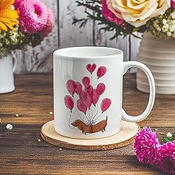 JRTW Dachshund Coffee Mug - Weiner Dog Ceramic Cup With Pink Balloon Design - Doxie Gift for Dog Lovers