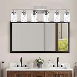 Specifications: This 6 light bathroom vanity light size is 95.0 x 25 x18.5 cm/37.4 x 10.0 x 7.4 inch, the junction box size is 20.0 x 12.0 cm/7.8 x 4.7 inch, the clear glass shade size is 13.0 x 10.0cm/5.1 x 3.9 inch Material: The bathroom light over mirror is made of brushed nickel finish construction, ceramic lamp head, and transparent glass lampshade, sturdy and anti-rust, modern and stylish, provide an elegant Illumination for your bathroom space E26 Base, Dimmable: The brushed nickel vanity lighting for bathroom support E26 base light sources( Edison, LED, CFL, Halogen, Incandescent light bulbs). It's dimmable while using with dimmable bulbs and a dimmer switch (bulbs and dimmer not included) Easy to Install, Reversible Up/Down Mounted: This 6 light bathroom lighting over mirror comes with instructions and all mounting hardware for quick and easy installation. it's hardwired and can be mounted up and down according to your different demands Wide Application: Our 6 light bathroom vanity lighting fixture is perfect for modern and farmhouse style space, like bathroom, bedroom, living room, over cabinets mirror, vanity table, corridor, which will create a bright and elegant lighting atmosphere After-Sales Service: You will receive 1 x brushed nickel 6 light bathroom wall sconce lighting fixtures, 1 x pack installation hardware, 1 x installation instructions. If you receive any quality issues with the product, please feel free to contact us