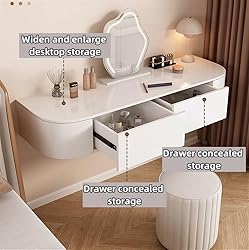 Floating Design for Space Saving: The hanging vanity features a floating design that frees up valuable floor space, making it an ideal choice for modern minimalist bedrooms. Its wall-mounted structure creates a sleek, uncluttered look, suitable for small spaces or those looking to maximize their room layout Drawers for Organized Storage: This floating vanity comes with spacious drawers that provide ample storage for your beauty products, accessories, and personal items. The smooth-gliding drawers make it easy to keep your essentials neatly organized and within reach, enhancing functionality and style Multifunctional Vanity: This vanity doubles as a practical dressing table. Whether you're applying makeup, doing your hair, or simply getting ready for the day, adds a touch of beauty to your bedroom Modern White Finish for a Clean Aesthetic: The vanity's modern white finish complements a wide range of interior styles, from contemporary to classic. Its clean, minimalist design enhances the overall aesthetic of the bedroom, adding a touch of sophistication A versatile product that can be used as a floating nightstand: In addition to being used as a dressing table, this piece can also be used as a floating nightstand. Its versatile design allows it to adapt to your needs, providing a convenient surface for table lamps, books, or other bedside essentials, making it a practical addition to your bedroom