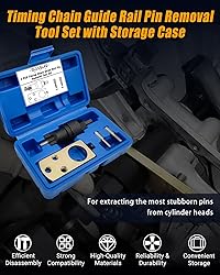 PRODUCT USAGE: The timing chain guide rail pin removal tool is designed to extract the most stubborn pins from the cylinder head, making the removal of the timing chain guide rail pins very easy. Effective for you to solve your troubles SUITABLE MODELS: Timing inner chain slider pin extractor set is widely compatible with Mercedes-Benz M102, M110, M115, M116, M117, M130, OM 601, OM 602, OM 603, OM 615, OM 616, OM 617 engine series. Strong compatibility QUALITY MATERIALS: This chain guide rail pin puller remover kit is forged from high-quality metal materials for durability. This guide rail pin puller incorporates a thrust bearing in order to ease the pulling action. Greatly saves your energy PACKAGE CONTENTS: Remover kit contains 3 spindles (5mm, 6mm & 8mm), a locking tool (72*32mm/2.83*1.26inch), a puller (Total length with spindle installed is 95mm/3.74inch, long enough to reach the problem area and solve it easily) EQUIPPED WITH CASE: All parts are organised in a sturdy blow-moulded case for convenient portability & transport. Tools are rigorously tested before leaving the factory to ensure accurate testing. Complete tools, use with confidence. Lubrication recommended before use