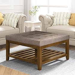 Superior Comfort: The large square ottoman is covered with breathable linen fabric, filled with high density sponge with TB117 standard; Cozy and supportive design ensure your tea tray can be placed firmly on it Variety of Uses: Suitable as a coffee table in the living room, it comes with an open storage shelf that provides the space;The padded top can also offer a cozy rest for your tired feet, serve as an extra seating for your friends Elegant appearance: Minimalist square design and tufted surface bring you a timeless style that can match all of your décor, while the wooden storage frame not only provides storage space, but also makes a guarantee for stability as well Sturdy Construction: The solid wood frame ensures excellent stability, the top surface can support up to 400 Lbs, the open storage shelf can support up to 100 Lbs; The dimensions of square ottoman: 33.5"Wx33.5"Dx18.5"H Easy Assembly: Each of our tufted square coffee tables ships with all of its own accessories and comes with instructions; It can be assembled successfully with simple screw links and can be completed in about 10 minutes by a single person
