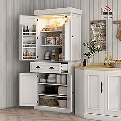 - Light up your kitchen organization with the HOMCOM storage cabinet with doors and shelves! Featuring adjustable LED lights with motion and light sensors, this tall cabinet offers customizable illumination. Enjoy ample storage with a drawer, four adjustable shelves, and six side door shelves, all secured with magnetic locks for seamless access. Transform your kitchen storage into a well-lit, functional space!