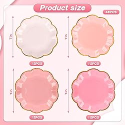 - Approx. 7" diameter. Each pack contains 24 paper plates in 4 special shades pink. perfect size for party The scalloped edges of our pink paper plates add an elegant touch to your tableware, making them perfect for any occasion Made from thick, reliable paper with a protective film, ensuring they are resistant to water and oil. Serve cupcakes, candies, and snacks with confidence Specifications: Materials: paper Size: 7 inch s Color: pink and gold Package includes: 24 x paper plates Notes: Manual measurement, these may vary in sizes slightly The color may exist a slight difference due to different screen displays