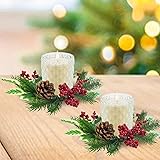 Candle Wreath Rings Set: Includes 4 green candle wreaths, each with a 3.6 inch inner diameter, features pine branches, 2 pine cones, red berries, and green leaves Long Lasting: These christmas candle rings for pillars are crafted from robust, flexible iron wire and plastic, sturdier than real pine branches, can be bent and adjusted multiple times without breaking Easy to Use: These pine candle rings fit candles of various sizes, connect the ends to form a circle, or adjust them to create an inner diameter smaller than 3.6 inches No Maintenance: These candle rings wreaths feature a surface that is simple to clean and resist fading, making it easy to keep them looking new without upkeep Christmas Decor: These winter candle rings double as small Christmas wreaths, making them perfect for home, wedding, living room, holiday party, or as table centerpieces, easily adding a festive touch