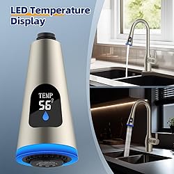 LED Temperature Display: Hygie Rinse pull-down faucet head designed with LED temperature display powered by water flow, provides real-time temperature readings and blue lighting in dark environments for both ambiance and practicality Four Function Sprayer head: Multiple water flow modes are available to adapt to daily use flexibly: Soft Bubble Mode for gently rinsing, Strong Spray Mode for rushing, the Water Blade Mode for scouring the stubborn stains, and One-click to stop and revert Considerate Fitting Kits: Comes with 15pcs adapters compatible with American Standard faucets, AquaSourse, Kohler, Hansgrohe, Grohe, Moen, Delta, and almost all types of faucets; Included aerator key/O-ring washer/Teflon tape for installation Premium Raw Material: Hygie Rinse Pull Down Kitchen Faucet Head is made of good quality thickened plastic and covered with a fine metal finish, lightweight and delicate; Silicone nozzle, easy to clean and rust-resistant, ensuring water quality All-round Cleaning: The pull-down sprayer head can adjust the angle and position of the nozzle at will, easy to flush each sanitary dead corner; The nozzle is designed to make the water flow concentrated and does not cause polluted water splash