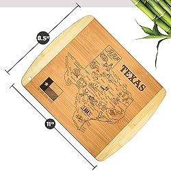 - Show your love for Texas with this engraved bamboo cutting board featuring a detailed Texas state map. From small towns to iconic landmarks, it adds a fun, meaningful touch to any space.Use it as a Texas charcuterie board, snack tray, serving board, or everyday cutting board. The engraved front looks great for serving, while the smooth back is perfect for chopping vegetables, fruit, and more.If you're looking for Texas themed gifts, this board makes an easy and thoughtful choice for housewarming, birthdays, Christmas, new home celebrations, or sending a small Texas souvenir to friends and family.Made from durable bamboo, it’s lightweight, sturdy, and brings warm Texas kitchen décor to any home. Hand wash only.Bambüsi makes simple, meaningful state boards that feel personal and easy to gift.