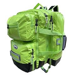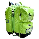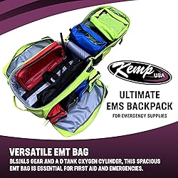 - The Kemp USA Ultimate EMS Backpack is best known for its size, durability, and design. It is designed for all emergency responders in any rescue situation. This EMS Backpack is popular among ambulance personnel, firefighters, search & rescue teams, and the military. They are designed as a top-grade bag that will last for years. Great for entry-level or seasoned professionals. SIZE Designed to carry all your essential BLS / ALS equipment comfortably and efficiently. Have everything you need at a first response scene in one well-organized backpack. This bag weighs approximately 8 lbs and measures 13” deep x 18” wide x 20” tall. DURABILITY Super thick tarpaulin water-resistant fabric for superior tear and abrasion strength Reinforced bar tack stitching at stress points Nickel metal hardware Top carry handle is bar-tacked and stud-reinforced Bottom is a heavy-duty wipeable black vinyl with raised molded feet DESIGN Functionality Backpack style EMS bag Bright Neon Green Color and reflective striping for quick and distinct identification at night time or during bad weather Quality, oversized zipper pulls for quick and easy access to compartments without frustrating zipper snags Color-coded Modular Pouches (8 removable pouches in varying sizes) make organization easy Three different grab points; top handle (stud-reinforced), side handle, and backpack straps Padded shoulder straps and padded lower back lumbar support Chest strap and waist strap help distribute the weight evenly for long-distance carry (3) name tag /label placards (located on front and sides, hook and loop removable) Compartments (zippered) Two large quick-access in front (with MOLLE webbing in the lower compartment) Two large long lateral compartments provide additional quick access to color-coded pouches Laptop sleeve compartment measures 16” x 11” x 1” Main compartment opens to a lay-flat position offering optimum access and visibility to all your larger gear. The main compartment has four large removable color-coded pouches that are secured by hook and loop. It can also hold a D oxygen cylinder tank.