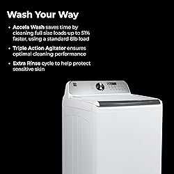 Tough Action for Tough Stains: Our top load clothes washer features a Triple Action Agitator to tackle your toughest loads in three powerful ways: Spraying Action to attack dirt from every angle with a concentrated detergent mix, Wash Basket Action to move the wash basket back and forth, and Agitator Action to move clothes in a circular pattern More Laundry, Less Time: Our high-efficiency top load washer features Express Wash to clean small loads in just 28 minutes (based on a 3-lb load, default cycle setting), and Accela Wash to clean full-size loads up to 51% faster (compared to a standard 8-lb load, normal cycle, warm wash temp, extra heavy soil setting) - so you spend less time doing laundry Wash Your Way: Features 10 wash cycles to custom wash your loads including Heavy Duty, Whites, Towels, Delicates, and Express Cycles. Select from 4 temperature options and rinse with Extra Rinse to help protect sensitive skin. Soft Close lid has tempered glass and won’t slam shut Easy to Operate: Use the intuitive light-touch controls to select the load and cycle options that match the fabric types in each load. Plus, the convenient LED lights provides time remaining and cycle status information Reduce and Save: Energy savings includes Cold Clean which cleans gently & completely while using up to 90% less energy (when compared to the normal cycle, default settings, 8-lb load)