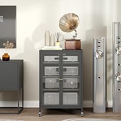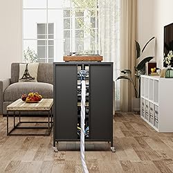 Spacious and Versatile Storage: This stereo cabinetl media cabinet boasts four spacious shelves, perfect for storing DVD players, receivers, books, and more, catering to the diverse storage needs of your home theater setup. Cleverly designed cable management holes keep your wires organized and tidy. Adjustable Shelving and Mobility: Metal media storage cabinet featuring three adjustable shelves to accommodate various audio and video equipment sizes, this media storage cabinet offers flexibility. Additionally, two swivel wheels with brakes and two without ensure easy mobility and stability. Rugged and Durable Construction: The audio-video media stand rafted from cold-rolled steel sheets, this audio rack cabinet promises a sturdy and long-lasting structure, ensuring it withstands the test of time without deforming or compromising its integrity. Tempered Glass Doors for Visibility: The tempered glass doors allow you to showcase your stored items while protecting them, ensuring your electronics can still receive signals effortlessly through the glass. Easy installation: If you encounter any difficulties during the assembly process, please contact us. Note: Please view the installation video before installing the product.
