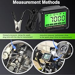 Engine Tachometer: IPX68 waterproof chainsaw tachometer measure petrol engines; Measuring range: 0-36000 RPM; Measurement accuracy: 1%; Timing Range: 1-9999hours; Timing accuracy: 0.1H; Refresh Rate: 0.5s Two Backlit: Default green backlight help to use at night or dim place, Red backlight will remind when engine RPM is higher than set programmable RPM alarm value; You will Get: 1*Tachometer, 1*Alligator clip sensing wire, 3*O-ring, 1*User manual Two Measure Methods: clamp the spark plug wire with the clip to receive the signal; , supports inductive measure, optimal sensing distance 3cm-5cm; safe and reliable; No external power connections are required, long service time Multifunction Digital Tachometer: Tach Hour Meter, TOT, JOB, SVC, MAX RPM, RPM mode setting, RPM Alarm, CLOCK, Auto sleep and Reset, Battery power detection; when the battery shows low, replace the battery in time and data will be memorized and not lost Widely Application: Induction tachometer suitable for any gasoline engine, like chainsaws, hand-push lawn mower, weed whacker, motorcycle, off-road vehicle, beach car, snowmobile, go kart, gliders, automobiles, engineering vehicles, ATVs, motor boats, grinders, generators, vibration machine mechanical equipment etc