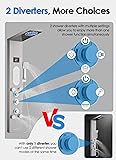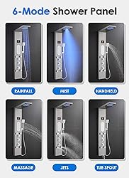 Compatibility & Installation: This shower panel is NOT compatible with regular single-pipe plumbing systems or existing rough-in valves. It requires a direct connection to hot and cold water supply hoses and includes a built-in mixer valve. To install, you'll need to remove your existing valve and trim, and possibly reroute your plumbing. Drilling into tiles is required for mounting. Size: Height: 50", Width: 7.8", Reach: 19.5". Functionality & Usage: Enjoy a luxurious shower experience with Rainfall, Mist, Massage Spray, Body Jets, Handheld Shower, and Tub Spout options. The 3 knob handles are intuitive and simple to use, and you can enjoy 2 shower modes simultaneously. Features include water-powered LED lights and a digital display showing water temperature and shower duration. Durability and Reliability: Built from premium stainless steel, this shower panel is designed to resist corrosion and stand the test of time. The high-quality copper valve and diverter, featuring a ceramic cartridge, ensure smooth operation and lasting durability. For any quality issues, we provide free replacement parts to keep your shower functioning perfectly. MIST & RAINFALL SHOWER PANEL: The shower head panel offers 2 soothing modes: MIST Mode: Surround yourself in a gentle mist that calms your mind and relaxes your body. RAINFALL Mode: Enjoy full-body coverage without needing to turn around, making it effortless to rinse away shampoo and conditioner. POWERFUL BODY JETS: Experience a luxurious massage with our 2 types body jets, designed to enhance your overall well-being. The system includes 1 large side spray (61 pcs nozzles) and 4 smaller, angle-adjustable jets, providing complete back coverage. Customize the spray direction for every height, ensuring a personalized and relaxing shower experience for all family members. The LED lights, digital display, and LED ring light on the shower handle are powered by a built-in turbine. When water flows through the turbine, it generates electricity to operate these features. If the LED lights or temperature display stop working, simply contact us, and we'll quickly send you a replacement turbine.