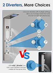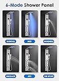 - Purchase Tips 1. Shower Panel Dimensions: This shower panel measures 50 inches tall, 7.8 inches wide, and extends 19.5 inches from the wall. 2. Multiple Functions: Features include Rainfall, Mist, Massage Spray, Body Jets, Handheld Shower, and a Tub Spout. 3. Simultaneous Shower Function: Two shower modes can operate simultaneously for a versatile experience. 4. Easy-to-Use Controls: The lower knob controls water temperature and turns the shower on or off. The two upper knobs let you switch between six functions effortlessly. 5. Plumbing Compatibility: Not compatible with regular single-pipe plumbing systems or existing rough-in valves. It connects directly to hot and cold water supply hoses and has a built-in mixer valve. Installation requires removing the existing valve and trim and potentially rerouting plumbing. Core Features 1. Energy-Efficient LED Lights: LED lights, temperature display, and knob LED rings are powered by water flow - no batteries needed. 2. Rainfall Shower Head: Delivers a high-pressure, continuous water stream for a relaxing, spa-like experience. 3. Mist Shower: Creates a luxurious, refreshing mist with ultra-fine water droplets for gentle, full-body coverage. 4. Body Jets: Includes two types of massage jets to relieve stress and revitalize your muscles after a long day. 5. Handheld Shower wand: Features a high-pressure spray, perfect for rinsing, bathing kids or pets, and cleaning the shower area. 6. Waterfall Tub Spout: Designed to quickly fill your tub with ease. 7. Low-Maintenance Nozzles: Equipped with clog-resistant rubber nozzles that are easy to clean and prevent calcium buildup from hard water. After-Sales Service The LED lights and temperature display are powered by an internal water turbine. If these features stop working, it may be due to a turbine issue. Simply reach out to us, and we'll promptly send you a replacement turbine to restore your shower panel's functionality.