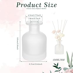 - Elevate Your Space with Custom Aromatherapy - Professional 150ml Glass Diffuser Bottle Introducing the perfect vessel for creating personalized aromatic experiences. Our 150ml glass diffuser bottle combines elegant design with intelligent functionality, offering a premium foundation for your favorite essential oil blends. Whether you're an aromatherapy enthusiast or simply seeking to enhance your home's ambiance, this beautifully crafted bottle delivers exceptional performance. Why This Diffuser Bottle Excels: 🔬 Dimension 2.64-inch Weighted Base: Provides exceptional stability on nightstands, desks, and shelves 0.7-inch Narrow Opening: Reduces oil oxidation and extends fragrance duration compared to wide-mouth containers 3.9-inch Compact Height: Fits perfectly in bathrooms, offices, and smaller living spaces without dominating surfaces 🌹 Create Your Signature Scent Fill with your preferred essential oil combinations to: Promote relaxation with lavender and chamomile Boost energy with citrus and peppermint Purify air with eucalyptus and tea tree Set romantic moods with rose and ylang-ylang Celebrate seasons with holiday-inspired blends 🎁 The Ultimate DIY Gift Foundation Transform this bottle into a thoughtful present by: Selecting recipient's favorite scents Adding premium diffuser sticks Including personalized blending instructions Ideal For: Homeowners refreshing living spaces Office workers creating focused environments Wellness practitioners enhancing treatment rooms Wedding planners designing memorable venues DIY enthusiasts crafting personalized gifts Specifications: Material: Glass Capacity: 150ml / 5oz Height: 9.9cm / 3.9 inches Base Diameter: 6.7cm / 2.64 inches Mouth Opening: 1.8cm / 0.7 inches Package Includes: 1 x 150ml Glass Diffuser Bottle