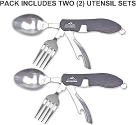 All-in-one convenience: Combines essential dining utensils like spoons, forks, and knives with the added utility of a bottle opener, catering to various needs during camping trips. Plus you get two in a pack. Pocket knife-style foldability: The convenient pocket knife-style foldability allows you to easily stash it in your backpack or pocket, adding a touch of convenience to your outdoor gear. Durable construction: Crafted from robust materials such as stainless steel or titanium, ensuring longevity and reliability in rugged outdoor environments. Versatile functionality: Apart from mealtime use, these utensil sets can serve multiple purposes, including food preparation, cutting tasks, and even minor repairs around the campsite. Space-saving design: The collapsible nature of the utensil pack allows for efficient storage, maximizing available space in your camping gear while ensuring you have all the essential tools readily accessible when needed.