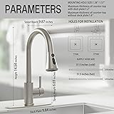Made with SUS 304 stainless steel, this kitchen faucet guarantees lasting performance while meeting lead-free safety standards. The faucet features a ceramic cartridge that prevents drips and an integrated aerator that helps save water, delivering a flow rate of 1.8 GPM at 60 PSI Offering three water modes: Stream for filling, Spray for rinsing, and a powerful 360° rotating blade spray for deep cleaning, this faucet is designed to meet all your kitchen needs. The 17-inch retractable hose provides ample coverage for your sink, making tasks effortless Our faucet comes with pre-installed hoses and all necessary hardware, allowing you to complete the installation in under 15 minutes without requiring professional help. It’s designed to fit 1 or 3-hole sinks, with an included detachable 10-inch deck plate for easy installation The faucet’s surface is treated with advanced nanotechnology to resist rust and stains. Cleaning is as simple as wiping with a cloth, ensuring your faucet stays looking new with minimal upkeep We provide comprehensive services for the product, ensuring your peace of mind when purchasing. Additionally, our dedicated support team is available to assist with any installation or product-related inquiries, providing peace of mind with every purchase