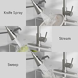 - Upgrade your kitchen experience with this high-performance pull-down kitchen faucet, designed for modern convenience and lasting durability. Crafted from premium SUS 304 stainless steel and equipped with advanced features, this faucet seamlessly combines functionality, safety, and style to meet all your kitchen needs. Key Features: 1.Three Versatile Water Modes: Switch between Stream, Spray, and a powerful 360° Blade Spray to tackle any kitchen task. Whether filling pots, rinsing vegetables, or cleaning stubborn residues, the multifunctional sprayer ensures efficiency and precision. 2.High-Quality Materials: Made with lead-free SUS 304 stainless steel, this faucet guarantees durability and safety for your family. The ceramic cartridge and integrated aerator prevent leaks and save water, offering a flow rate of 1.8 GPM at 60 PSI. 3.Ergonomic and Flexible Design: The high-arc spout swivels 360° for full sink access, while the 18-inch retractable hose provides extended reach for effortless cleaning. The single-handle lever allows smooth control of water temperature and flow. 4.Effortless Installation: Pre-installed water lines and included hardware make installation a breeze. The faucet fits one- or three-hole sinks with a detachable deck plate, ensuring compatibility with various kitchen setups. 5.Easy Maintenance: The advanced nanotechnology finish resists rust, fingerprints, and stains, keeping your faucet looking pristine with minimal effort. Why Choose Our Faucet? This pull-down kitchen faucet not only enhances your kitchen's functionality but also adds a touch of elegance with its sleek design. Ideal for homes, RVs, and outdoor kitchens, it fits seamlessly into any space. Backed by a comprehensive warranty and dedicated customer support, this faucet ensures a worry-free experience from installation to daily use.