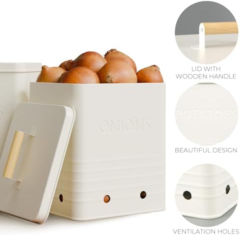 - Decorative Chic For Everyday Life: With its timeless color, embossed details and stylish, practical wooden lid handle, the onion bin and potato storage box add a pop of charm to any kitchen, effortlessly blending with both modern and rustic, farmhouse decor