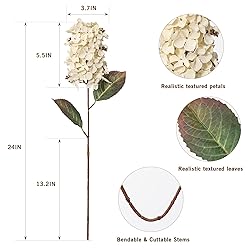 - Our artificial hydrangea is a stunning decorative piece that will enhance the beauty of any space. The color is achieved through advanced 3D printing technology, ensuring a soft and high-class appearance. The delicate and realistic petals, along with clear textures, make it look amazingly lifelike. Measuring 24 inches in height and 3.7 inches in flower diameter, the slender flower head and two leaves on each branch present a harmonious and natural look. The branches are highly flexible, enabling you to customize the flower's height according to your specific decoration requirements. The autumn-colored leaves with distinct veins add a touch of elegance and sophistication. Whether you're going for a European and American country style, American style or modern decor, this artificial hydrangea is the perfect choice to bring a touch of nature and charm into your home