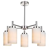 - VINLUZ Contemporary 5 Light Large Chandeliers Modern Opal White Glass Shades Pendant Lighting Brushed Polished Nickel Dining Room Lighting Fixtures Hanging Adjustable Wire Semi Flush Ceiling Lights UL LISTED-one safe chandelier lighting.Sloped ceiling available and Adjustable Height, includes four 10" hard stems to allow a variety of hanging heights with a clean, finished look. This Handmade 5-light chandelier is beautifully crafted in a industrial look. Its traditional design in brushed nickel finish adds the perfect touch of elegance to your dining room,entryway or foyer.