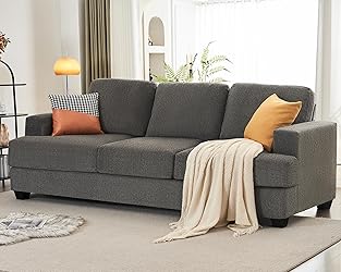 - VanAcc Upgraded Modern SofaOur comfy sofa offers the best experience for your leisure life. 3 seater sofa is designed with sleek truck armrest and deep seating area. Creamy cloud-like chenille fabric covered on deep seat sofa enhanced the feeling of calmness to the sofa couch perfectly. Clean line design enriches modern sofa, creating a perfect sofa for living room. The use of hardwood underframe contributed to the solidity and durability of sofa. Features-3 Seats sofa with back and seat cushions-High resilience foam cushions-Covered with Bouclé Fabric-Sturdy structure with hardwood underframeRecommended Rooms-Living Room-Apartment-LoungeMaterial & Care -Fill Material: high density foam-Cover Material: Bouclé fabric-Underframe: solid wood-Backframe: steel-Wipe with damp clothDimensionsWidth: 89inchDepth: 36inchSeat Depth: 23inchHeight: 35inchSeat Height: 18inchArm Height: 26inch