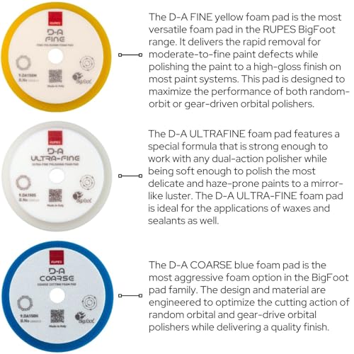 RUPES D-A Series 6" Orbital Foam Polishing Pads Bundle - Includes 2 Fine, 2 Ultra Fine and 2 Coarse Foam Pads - Tailored to Meet The Diverse Needs of Automotive Detailing