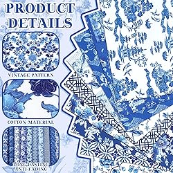 Package Includes: the package includes 10 pcs different design chinoiserie cotton fabric, about 18 x 22 inches/ 45.7 x 55.8 cm, can be cut with scissors, providing an assortment of options, offering crafting flexibility and limitless design possibilities Exquisite Pattern Design: the cotton floral patchwork strips are designed with 10 different patterns, featuring a theme of blue and white porcelain, with beautiful colors and exquisite lines; You can match different patterns according to different occasions Quality Material: these chinoiserie cotton fabric is made of polyester cotton material, soft, comfortable, durable, and breathable; They can be applied for sewing, quilting and handicrafts, with beautiful colors and clear patterns Suitable Size: each blue and white porcelain fabric is about 18 x 22 inch/ 45.7 x 55.8 cm, meeting various handicraft needs; You can cut it according to your needs for activities such as making dolls, repairing clothes and more Versatile Application: the quilt precut fabric strips can be applied for quilting, making patchwork bags, clothes, wallets, tablecloths, ideal for mending clothes, quilts, curtains, also for making gift decoration, holiday ornament, album or doll clothe