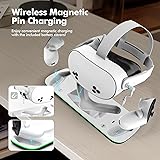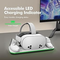 NOTE: Using the original Meta charger or a charger with a power of 15W or higher will maximize the charging success rate. Ultra-thin design: The charging dock's sleek, compact design allows effortless use in any environment, while making cleaning, storage, and portability a breeze—saving you valuable space. (Advice: make sure the silver strips on the batteries face outwards, otherwise the controllers wont charge! ) Minimalist, Light Pollution-Free Design: Seamlessly blends into any environment – whether it’s a bedroom, office, or living space – with its clean aesthetics and subtle profile. Unlike overwhelming RGB effects, its gentle ambient light reduces eye strain and adapts effortlessly to diverse settings, from late-night relaxation to focused workspaces. Accessible LED Charging Indicator: The charging station has stylish indicator lights: orange for charging and green for fully charged. You can conveniently toggle the LEDs on and off using the switch located at the rear of the dock. Stable Charging Protection: The charging station compatible with the Meta Quest 3 and Meta Quest 3S offers the convenience of fast charging. It can charge both your VR headset and controllers simultaneously, ensuring your VR gear is always ready for the next immersive experience. Multiple safety features including overcharge, short-circuit , and over-heating protection ensure safe and stable charging for your devices Rechargeable Batteries Included: Includes 2 x 900mAh rechargeable batteries for controllers, each offering up to 2000 charge cycles, Reduce the hassle and cost of frequent battery replacements Neat Storage Option: Create a neat and organized gaming environment with our VR charging dock station, which provides a dedicated spot for your headset and touch plus controllers, ensuring they're always accessible for gaming sessions. At the same time, it also reduces the complexity of storing your equipment after each use