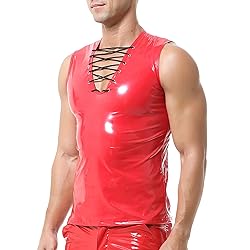 - Package Include: 1 x Men's Faux Leather Undershirt Feature: Faux leather material,chest lace up design, V-neckline, Sleeveless, makes you very cool and helps you to show your healthy muscles to make you more attractive Color: Black, Red, Bright-red Size: M / L / XL / XXL Occasion: clubwear, holiday, prom, nightclubs, casual, party, fashion wear etc.
