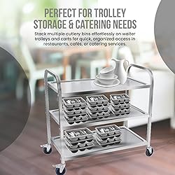 2 Pack - 3-Compartment cutlery bins with lid to provent dust Stackable, perfect for use in restaurant kitchen storage Ideal for condiments packets, creamers, ketchup, mustard Made with Durable BPA Free Polyethylene material O/A dimensions: 16 In. X 11.5 In X 4 In.