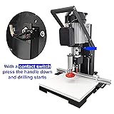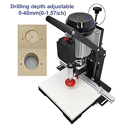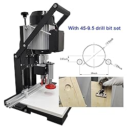 [Function] The hinged drilling machine is mainly used for cabinet, wardrobe, door processing and manufacturing. Three holes in the vertical position can be processed at one time, including one big hole for hinge head hole and two for assembly screw hole. [Press the handle to start drilling] The woodworking drilling machine uses 1100W pure copper motor with 2840rpm/min rotating speed, powerful and drilling fast. Equipped with a pushdown handle for one-handed operation. With a contact switch, press the handle down and drilling starts. [With 45-9.5 drill bit set] With 45-9.5 combined drilling bit. The distance between the centers of the two small holes is 1.8inch (45mm). The diameter of the big hole is 1.4inch(35mm). The diameter of the small hole is 0.3inch(8mm). The depth of the hole can be adjusted by rotating the nut on the rear side of the engine. Drilling depth is up to 0-40mm(0-1.57ich). [High accuracy] With air spring pressing device and board will be fixed firmly during operation for accuracy. With 19.6inch long ruler for accurate drilling and the ruler can be moved front and back. Two clamps are equipped on the ruler to fix the board. The clamps can slide on the ruler and you just need to move the clamps and the boards will also be moved and you can dill holes at different positions. [Special Design] The portable electric hinge drilling machine is equipped with thickened working table whose size is 13.6*11.8inch and high quality drill combination, easy to operate. Thickened material of high strength spring, not easy to deformation for stability. Small body, easy to carry and move.