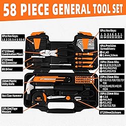 SMALL TOOL KIT: This 58 piece home Tool Set is an essential tool set for daily home project and maintenance like furniture assembly, picture hanging and general purpose repairs, apartment, dorm room, or garage and automotive needs TOOLS BOX LIST: (1) 8 oz Claw Hammer, (30) screwdriver bits, (1) bit driver, (1) bit holder/extension (16) hex keys, (4) precision screwdrivers, (1) slip joint plier, (1) tape measure, (1) utility knife, (1)8" Scissors (1)Hammer Cover (1)Storage box DURABLE& RELIABLE: All the tools are constructed from premium material and precisely manufactured to ensure durability and longevity EASY ORGANIZATION: The Tools come neatly organized in a small hard plastic case to keep all your tools organized and securely stored, small enough to be hidden in closets, your garage or even under the kitchen sink THE PERFECT GIFT: This tool set contains useful tools for any basic household repair, and doubles as the perfect thoughtful gift for any new grad headed to college, or a friend or family member moving into a new apartment or starter home