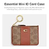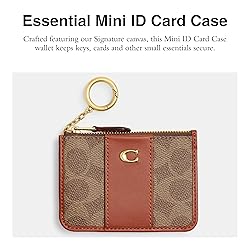 Editor's Notes: Crafted featuring our Signature canvas, this Essential Mini ID Card Case wallet keeps keys, cards and other small essentials secure Our Signature Canvas: The best kind of mix up. This rich, mixed leather design combines sophisticated refined calf leather with our signature canvas - for a perfectly iconic Coach wallet On-the-go Essentials: This Essential Mini ID Card Case keeps keys, cards and other small essentials stylishly secure It's All in the Details: Credit card slot and ID window, zip-top closure, fabric lining, attached split key ring. 4 1/4" L x 3" H This is COACH: Having the courage to be real since 1941. COACH is the Original American House of Leather - with a legacy of craft and a community that champions the courage to live authentically