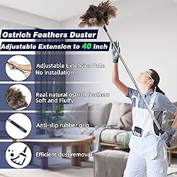 -Adjustable Extension Pole Duster: Our ostrich feather duster can be freely extended and retracted, with a maximum length of 40 inches. Within the size range, you can adjust and fix the length you need. No assembly required,no longer need a ladder or footstool to clean hard to reach areas -Household High-efficiency Cleaning Duster: Our long extendable duster features 100% natural high-quality ostrichfeathers.Ostrich feathers has natural flexibility and adsorption, which can easily remove various stains, including dust, oil stains, water stains, and soil,is an ideal choice for cleaning glass vases and electronic screens -Sturdy and Durable Design: Feather dusters for cleaning use, we have thickened the feathers. The rod of the feather duster is made of newly designed stainless steel material,no rust, long lifespan,which has been upgraded to be more sturdy, and the tail is also covered with an anti slip protective cover -Multi-Purpose Cleaning Tool: A retractable large handle ostrich feather duster can clean the entire house. Not only can it clean the desktop, but it can also reach places that cannot be reached from high places such as ceilings, ceiling fans, blinds, etc -Proper Use and Care Instructions: Before use, you can shake it in your hand or hang our reusable duster in the sun for 2 hours to make the feathers more fluffy. Of course, you can use it directly. After completing the cleaning work, you can also shake it to remove dust, or clean it with warm water and let it air dry naturally until fluffy. When you don't need it, you can put it in a vase as decoration