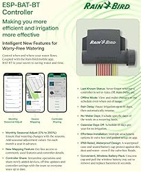 - Controller Features Battery changes have never been easier; wireless battery pack simply pulls out to remove and replace batteries in seconds Up to 5 years battery life with four high-quality AA batteries IP68 rated waterproof design built to withstand the harshest conditions; protect against dirt, dust and water…even if the valve box floods frequently Rain Bird 2.0 App Features Advanced Mapping: Map pins turn red when battery is below 30%. Select a mapping pin and access commonly used shortcuts: manual water, edit controller, battery status, controller sharing, change address, Bluetooth status and delete device. Offline Mode: Edit, track, and save desired controller changes in the app, even when out of Bluetooth range. Review change log at anytime. Rapid synchronize change log when back on site and in Bluetooth range. Controller Sharing: Streamline operations and collaboration with your team. Share secure access of any and all devices with new team members. Keep existing team members up-to-date with on-site controller changes or make offline changes from anywhere and share with a team member on site for synchronization, saving a site visit. Monthly Seasonal Adjust: Seasons change and so should your water schedule. Program adjustment values by month for the entire year in advance, saving not just water but site visits. Cycle & Soak: Eliminate runoff, a common form of water waste by breaking up the total run time into shorter cycles so the soil has time to soak in the water (available down to 7 second cycles). Seconds Based Irrigation: Run times go down to 7 seconds allowing one second intervals (7 seconds to 18 hour run times). Calendar Days Off: Have a future event in the park and you want to be sure irrigation doesn’t run? Schedule the day(s) off ahead of time, saving a site visit. Permanent Days Off: Do you always mow on Thursdays? Exclude certain day(s) of the week on a recurring basis, no matter the chosen watering frequency. (Odd, Even and Cyclic) Additional Images: Quickly identify stations and sites via custom imagery. Interstation Delay: Allow a delay between a station turning off and another turning on. This ensures your hydraulics are never compromised. Rain Delay: Is rain coming? Save a site visit, turn the controller off for up to 14 days and then auto-resume irrigation. If rain is expected for more than 14 days set Monthly Seasonal Adjust values to 0%. Pause Active Irrigation: If and when a broken nozzle occurs, simply pause the station, fix the issue and resume right where the irrigation program left off. Search & Filter: Easily find controller(s) right from the home screen. Sort by name, controller type, recently added or last connected. Filter by Bluetooth in range, sync available or low battery. Controller Grouping: For sites with multiple battery-operated controllers, add multiple controllers to a group for organized on-site operations. Quick Status: View all your connected controllers and their most relevant statuses: controller auto, controller off, rain delay, calendar day(s) off, battery life and Bluetooth connection. Operating Specifications Rain Bird 2.0 App; available for Android and iOS devices Master Valve/Pump output on all models Basic programming includes four independent programs A, B, C and D each with 8 start times per day Stations can be assigned to several programs with different watering run times Run time is from 7 seconds to 9 hours (max 18 hours with 200% seasonal adjust) in 1 second increments Independent station operation allows sequential start times (with stacking in case of overlap) Operates one valve per station Global Monthly Seasonal Adjust; 0% to 200% (1% increment) Four watering day cycle modes (custom, even, odd and cyclical) with permanent days off so no irrigation takes place on mow days, selectable by program for maximum flexibility and watering restriction compliance Backup program may be saved and restored (manually or automatically for contractor default capability) No loss of irrigation program after a battery replacement Short and open circuit detection PIN code protection Direct Rain Sensor Connection accommodates the Rain Bird RSD-BEx Rain Sensor Rain Sensor shutoff globally or by station Operates with four AA alkaline batteries (AA, LR6, LR06): batteries not included Radio Frequency Specification Operation frequency band: Bluetooth, 2402-2480 MHz Maximum radio-frequency power: 9.95 dBm (for EU and UK) 9.66 dBm (for USA and Canada) Antenna type: PCB antenna Antenna gain: 2.41 dBi (for EU and UK) 2.35 dBi (for USA and Canada) Certifications - Product Compliance European Union: CE United Kingdom: UKCA Australia and New Zealand: ACMA-RCM USA: UL-US, FCC Part 15b & 15c, Bluetooth SIG Qualification Canada: C-UL, ICES-003, ISED RSS-247 Mexico: NOM, IFETEL Brazil: ANATEL Japan: MIC Saudi Arabia: CST South Africa: ICASA UAE: TDRA, ECAS-ROHS Egypt: NTRA IP68: Total protection against solids and water ingress Maximum Wire Run 12 AWG - 1250ft (381m) 14 AWG - 750ft (229m) 18 AWG - 300ft (91m) *Tested with all Rain Bird valves that are compatible with TBOSPSOL DC-latching solenoid *Max distances were tested up to 100 PSI Dimensions Width: 5.6” Height: 4” Depth: 2.5” Weight: 24 ounces (680g) including batteries Maximum wire run between the controller and TBOSPSOL solenoid: 98.4ft (30m) by using 1.5mm² (16 AWG) extended wire