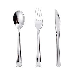 Elegant Silver Design: Elevate your table setting with our disposable flatware set. The sleek silver finish adds a touch of sophistication to any table setting, perfect for enhancing your event’s decor Durable Quality: our heavy duty silver silverware are crafted from 100% food-grade, BPA-free plastic, these silver disposable cutlery are strong enough to handle various foods without bending or breaking Complete Set for Large Gatherings: N9R bulk silver silverware set disposable includes 100 knives, 100 forks, and 100 spoons (300 pieces total), providing ample plastic utensils set for all your guests, ensuring you have enough elegant yet durable utensils for your party Versatile for Any Occasion: this heavy duty plastic cutlery set is an excellent choice for any celebration, ideal for birthdays, weddings, parties, and other special events, making them a great choice for any celebration Easy Cleanup: Our silver disposable utensils sets make cleanup a breeze, letting you focus on enjoying quality time with friends and family without the hassle of washing dishes. Spend more time celebrating and less time cleaning