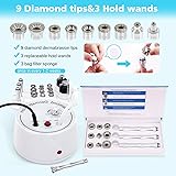 3 in 1 Microdermabrasion Machine:mwcdoit microdermabrasion machine tool has 3 functions:Microdermabrasion and Vacuum Suction and Spray function,and Removing the ageing cutin,blackhead, fade fine lines, dilute freckle and spot. By matching with the skin products to replenish natural nutrients, restore cell activity and promote skin health 9pcs Different Diamond Tips and 3pcs Wand: the package of diamond Micro-Mabrasion Machine offers 3 kinds of diamond wand and 9 different diamond tips.This diamond tips can be used in different needs and different parts of face or body. Depending on your skin's thickness, then choose the appropriate diamond tip Space-saving Machine& Professional Skin Care at Home: this space-saving professional microdermabrasion machine with detachable bracket allows you to get spa-level skin care results at a lower cost. Choose this at-home device and enjoy unlimited skin rejuvenation in the comfort of your home Deep Cleansing&Enhanced skincare Absorption:It deeply cleanses the skin, opens pores and enhances absorption of skincare products, allowing moisturizers, serums and essences to be fully absorbed for maximum effectiveness. Get salon-quality skincare from the comfort of your own home Versatile attachment and Easy to Clean with 2pcs Brush: the paakage includes: machine*1,glass tube tips*3,diamond tips*9,spray bottle*2,filters*2,cleaning brush*2,bracket*1,diamond wands*3,power cord*1,pvc hose*3,filter sponge*3. to clean the glass tube by cleaning brush, Present for Valentine's Day!