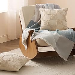 Double Stitch Checkered Throw Pillow Covers - 100% Cotton Set of 2 Tufted Boho Decorative Pillow Covers 18x18, Made in India, Square Cushion Case, Modern Home Decor for Couch, Sofa, Living Room, Oat