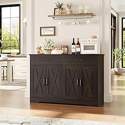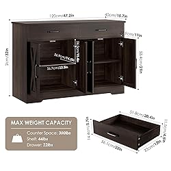 Ample Customized Storage: With two drawers for classified storage of knives or forks, two side cupboards for pots and pans as well as a spacious open area to place toasters and coffee makers, this buffet cabinet delivers amlpe storage space to maintain a neat and organized kitchen Modern & Farmhouse: Featuring barn-style doors in muted tones combined with a wood-textured top, this sideboard buffet cabinet is a welcoming addition that will add rustic charm to your interior, which can sit beautifully in your kitchen, dining room, living room or entryway Multi-functional Cabinet: Whether being used as a kitchen storage cabinet to organize utensils, a casual coffee station for daily coffee making, a storage cabinet to store outdoor items, or even as a TV cabinet to put your DVD player, this farmhouse buffet cabinet is an excellent choice Meticulously Crafted: The coffee bar with drawers is crafted from high grade engineered wood for long-term use, while the distinct base significantly strengthens its load-bearing capacity and enhances overall stability. Overall size: 15.7"D x 47.2"W x 31.9"H. Weight Capacity: 300 lbs Easy Assembly: This kitchen buffet comes with labeled parts and detailed instructions for easy assembly.