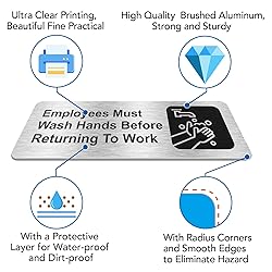 Good Reminder: The "Employees must wash their hands before going to work" sign is a good reminder for employees to know that it is good to wash there hands before returning to work. Helpful for Your Business: It's not only a good hand washing reminder, but also lets your customers know that how much your company attaches importance to sanitation, which increases the chances of guests returning to do business with you again. Sturdy and Duty Material: Our hand washing sign is 9" x 3", made from Rust Free Brushed Aluminum material that can withstand most environments, is waterproof and does not fade. Easy to Apply: Our heavy Aluminum sign comes with adhesive on the back. Just peel the double sided tape off and press it onto the door, wall or other smooth flat surface. Easy to Read: The sign is printed with black letters and pattern on a white board that ensures optimal visibility.
