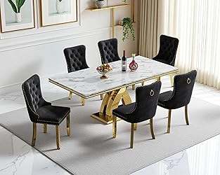 ➤Luxury 7 Piece Marble Dining Table Set: 7-Piece kitchen dining table set include 1 faux marble dining table, and 6 velvet dining chairs, which makes it perfectly sized for a dinette, kitchen, or any dining area. With a modern design and elegant shape, whether you want to enjoy dinner with your family at the dining table or gather with friends, this dining table set will be a good choice. ➤68.11" Marble Dining Table: This stylish marble dining table is perfect for bringing an air of modern style to your kitchen or dining room. Dining table is made of top quality 0.71" printed marble top and rust proof perfect combination, which is exceedingly stable, durable and beautiful, and the exquisite craftsmanship also adds to its spectacular classic retro style. ➤Dining Table and Chairs Set:This Luxurious Faux Marble Dining Table constructed with sturdy Sickle-Shaped Stainless Steel legs and 0.71" printed faux marble table top. The backrest and cushion of this dining room chair is made of soft and springy velvet, The backrest adopts an ergonomic design, which can support your back to ensure comfort without feeling back pains when sitting for a long time. ➤Multi-Purpose of Marble Dining Table: Contemporary dining table measures 68.11"L x 33.85"W x 29.53"H. Versatile and functional, its rectangular printed marble top offers that feeling of spaciousness and light that you are looking for in your home. Our modern marble dining table can be used in office, store, kitchen, dining room, living room, guest room or bed room as a dining table, living room table, coffee table, sofa table, office computer desk or conference table. ➤Easy Assembly and Premium Customer Service: Multiple packages with all screws, tools, and manuals. Installation is simple and fast by following the instructions, which can be finish in just 15-25 minutes. Please protect the tabletop to avoid breaking it when you are assembling the dining table. Any questions please feel free to contact with us first, we will provide replacement if you need.