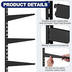 - Features: Well weighed: The adjustable shelf brackets are well weighed, Its robust make ensures it can withstand heavy objects without buckling under the pressure Double notch design: Secure double notch design for sturdy and strength to keep shelf and bracket locked into place Specifications: Material: metal Color: black Size: Shelf rail about 47.5 inches /120.65 cm Shelving brackets about 14.5 inches /36.83 cm Package includes: 2 x Shelf rails 6 x Track brackets Notes: Manual measurement, please allow slight errors on size. The color may exist a slight difference due to different screen displays.