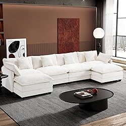 【Cloud Couch】The surface of the sofa is wrapped in high-quality chenille fabric, which is skin-friendly and breathable. The thick cushion is made of double-layer high-elastic sponge and fluffy fillment, making it more comfortable and soft. Experience the ultimate comfort of the sofa that feels like sitting on a cloud when resting. 【Ergonomic Design】Ihanherry U-shaped couch is equipped with four backrest pillow, two removable armrest pillows and two ottomans, providing extra support for the back and waist. Each pillow feels like as soft as clouds. When you sit on the sofa, it can cling to your back and waist, giving you an extremely comfortable experience. 【Flexible Modular Sofa】: Each modular piece of the cloud couch can be moved easily, and it is convenient to allow you to arrange them into any desired shape based on your preferences and needs. Customize your own sofa to fit different spaces, offering flexibility and style for your home. 【Sturdy Couch】The frame of cloud sofa is made of high-quality solid wood, making it more durable and sturdy. Each sofa can withstand a maximum weight of 440 pounds, exceeding that of most sofas. With a seat depth of 25.2", it is suitable for most body types and various sitting postures. 【Five Boxes Packaging & Easy Assembly】Overall Size: 56.3"D*146"W*33"H. Ottoman Dimension: 22.8"W*37"D*21.2"H. We put all the parts in five boxes for easy transport and sometimes they arrive at different times. The package includes all numbered parts, tools, and clear instructions. It comes with necessary tools, so no additional equipment is required. You can install it in 30 minutes by using the included detailed instructions. If you have any problem with the receiving, please contact us promptly