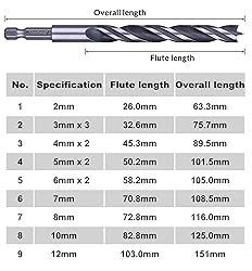 - · Precision milled brad-Point drilling tip for perfect self-centring, accurate positioning and fast drilling holes · Engineered double cutting edges and extra-wide flutes deliver fast chip removal for smooth and clean holes · 1/4-inch hex shank compatible with standard and quick change chucks and impact drivers · Suitable for wood, beech, walnut, elm, fiberboard, particleboard, plywood, plastic, PVC, MDF, acrylic, nylon, PU, Acrylic, rubber etc. · 12-Pieces common metric sizes in 2mm, 3mmx3, 4mmx2, 5mmx2, 6mmx2, 7mm, 8mm, 10mm and 12mm. Packed in easy storage case.