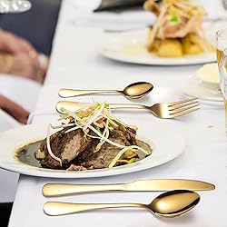 Glossy: The surface of these tablewares is glossy, which is as bright as a mirror. So the tablewares look very high end, elegant, and make the environment more romantic. Applicability: The cutlery set can be used at home or in restaurants. The set adopts gift box packing, which can also be used as a gift for families and friends. Good Tactility: The handle of this flatweare set has comfortable tactility and gives you a better experience when you use it, which is very user friendly. Reasonable Design: The knife fork spoon set adopts round head and big tooth design, which can give consideration to safety and not lose sharpness. Durable: The flatware set is made of cutting tool grade stainless steel, and has adopted thickening treatment and high temperature quenching process, making it very sturdy and durable.