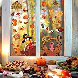 Thanksgiving window stickers: Maple leaves, turkey, acorn, pine cone, corns, hedgehogs, carrion, scarecrow, rice, apple, pear, grape, honey, house, cake, wine, etc. They are cute and will bring great fun to your autumn party 9 sheets, 109pcs. Various Thanksgiving themed patterns will satisfy you and your kids to freely decorate your home with windows, bedrooms, bathrooms, doors, windows and more. Perfect for fall Thanksgiving Day party decorations Durable and eco-friendly material, waterproof, removable and reusable. Easy to apply on any where smooth place, such as glass, tiles, refrigerators, mirrors, and more The static window sticker PVC material means that it can be easily applied without glue. Double sided design pattern will beautify office, school, store and home Service guarantee: Customer satisfaction is our greatest motivation, please feel free to contact us if you have any problems about this Thanksgiving stickers