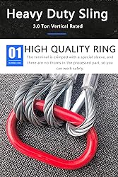 【4 Leg Wire Rope Sling】6610LBS Loading Capacity/ Wire rope slings length: 5FT./wire rope Diameter: 1/2''. 3 Ton with 4 Leg Wire Rope Slings. 【4 times safety factor】The Wire Rope Slings is made by 6X19 Galvanized Cable braided for greater strength that has good wear resistance and high temperature resistance, has a long service life, improves work efficiency, and is a convenient tool to carry. 【 5ft lifting wire rope with hooks】The sling ends are mechanically formed and Loops are secured with a forged metal sleeve over the spliced area along with heavy-duty thimbles to protect the ends of the sling.Such a safety design allows for greater load capacity. 【Humannized desige】This attachment style offers versatility and an additional level of safety with the latch positioned on the Eye Hoist Hook for a more secure connection. 【Heavy Duty Rigging Cable】It is perfect for various lifting and moving activities in Factories, Construction Sites, Mining, Ports, Building, etc. The heavy-duty chain sling is designed for cargo security towing and handling.