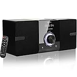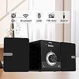 √ Home Stereo system --- The micro hi-fi system offers pure listening pleasure thanks to high-quality stereo speakers. This all-in-one hi-fi audio system is a complete solution for your hearing needs. Sit back and enjoy all that it has to offer. Dimensions--- (Main Unit); 150x210x183mmmm ; (Speakers) :133x185x159mm (each one) √ Multi-mode Micro Shelf System --- This CD stereo system is a complete solution that meets more requirements: ① Top-loading CD player supports CD/CD-R/CD-RW; ② Packed with features for listening to FM radio (NOT AM); ③ Wireless streaming of audio content from your smartphone/mobile phone via Bluetooth, ④Play MP3s/WMAs via USB, ⑤ 3.5mm aux input for playing audio from other devices. √ Rich & Clear Sounds --- LP-886 home stereo system Bulti-in DSP technology, provide 30W (2 x 15W RMS) via the power speakers: High-performance Balanced Woofers for powerful and transient bass. √ Unique design and Functional - - Two Wooden Speakers with rounded corners; Main mechine with big Knob, and white backlit LED display Screen; headphone jack for private listening; come with confortable remote control for convenient use. It also has memory function, 5 EQ modes and 3 repeat modes (one /all /random ) √ This home CD Player Stereo system Suitable for lovers, children, parents, friends, family members, colleagues as gift ! You get: 1 x CD Micro System Player, 1 x Remote Control(2AAA battery not include), 1x AC Power Cable,1 x User Manual. NOTE: When the unit is powered off (indicated by the red light being on and the display being off), the remote control cannot be used to switch it on. You must press the power button (standby) on the unit itself.